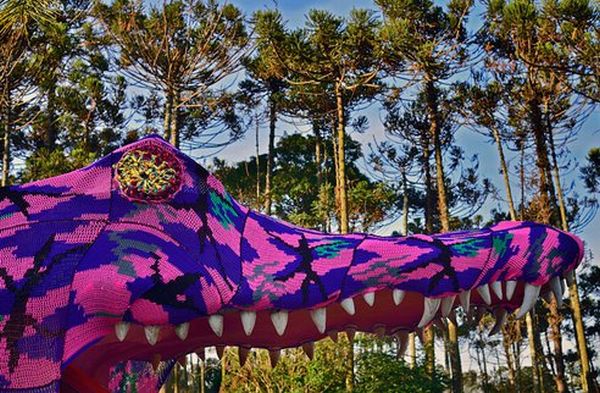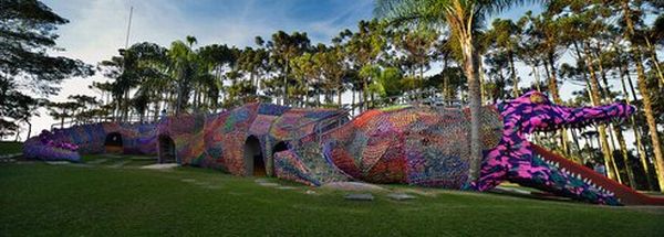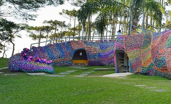 And this giant alligator playground in the city of Sao Paulo, Brazil by Agatha Olek is a wonderful example of this new art form that is not just brilliant ate painting vivid and striking images, but also uses crotched yarns with knotted ribbons for material. The giant alligator also incorporates some of the local Brazilian art and design elements to create a wonderful fusion between both styles.